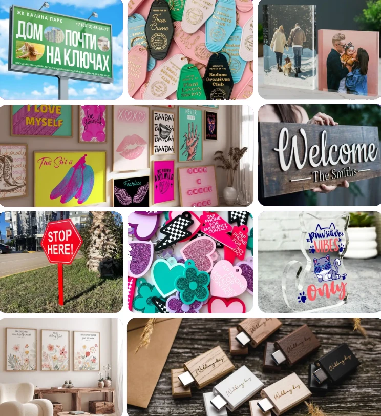 Materiały sztywne i elastyczne: Drewno, szkło, akryl, MDF, metal, kamień, skóra, folie PET, banery, tapety, materiały PVC i wiele innych.
